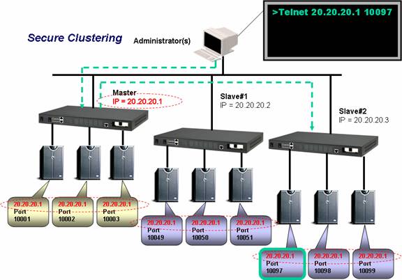 Durch Definition eines Master-IOLAN-Konsolenserver (oder zur Erhöhung der Belastbarkeit eines zweiten) können mehrere Slave-IOLANS zu einem einzigen sicheren Konsolenserver Cluster konfiguriert werden. Dies ermöglicht eine komplette Übersicht über alle mit den Master- und Slave-Einheiten verbundenen Anschlüsse. Es spielt keine Rolle mehr, welche IP-Adresse der Konsolenserver hat, der mit dem gesuchten Konsolenanschluss verbunden ist. Damit spart der Administrator wertvolle Zeit bei der Problembehebung. Der Zugang zur IOLAN-Cluster-Ansicht kann mit einem Internetbrowser über IOLANs EasyPort Web oder einem CLI-basierten EasyPort über eine Telnet- oder SSH-App erreicht werden. Über die benutzerfreundliche Oberfläche können Benutzer die Knoten in ihrem Netzwerk, unabhängig von der Größe, zügig segmentieren. Einfache rollenbasierte Genehmigungen und Knotenzuweisungen garantieren die richtige Berechtigungsebene für alle Benutzer.
